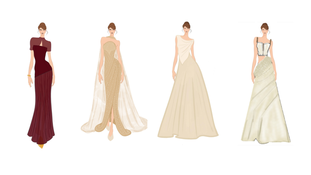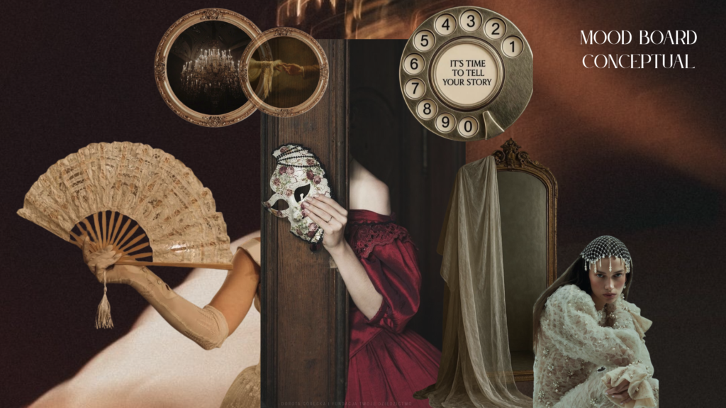 La moda como experiencia y memoria, más que como un objeto de consumo. Se plantea una visión donde las prendas acompañan momentos importantes y se convierten en recuerdos tangibles, integrando emoción, ritual y significado. Bajo esta perspectiva, el diseño busca trascender lo efímero mediante propuestas atemporales, sofisticadas y conscientes, que conectan con un usuario que valora la narrativa detrás de cada pieza y el impacto emocional del vestir. La inspiración surge directamente de la estética de Le Bal, especialmente de la reinterpretación contemporánea del estilo rococó, caracterizado por su delicadeza, volumen y riqueza ornamental. Se retoman elementos como el glamour clásico, las siluetas refinadas, el uso de materiales ligeros como la organza y el tull, así como los detalles bordados que evocan lujo y feminidad.